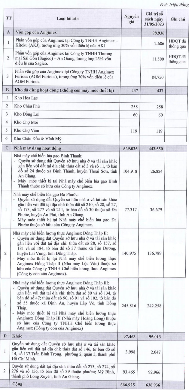 Do đó, với mục tiêu thanh toán dần các khoản nợ để từng bước vực dậy hoạt động sản xuất kinh doanh, HĐQT trình kế hoạch thanh lý tài sản như sau: Vốn góp của Angimex, kho đã dừng hoạt động (không còn máy móc thiết bị), nhà máy đang hoạt động, quyền sử dụng đất tại TPHCM và An Giang.