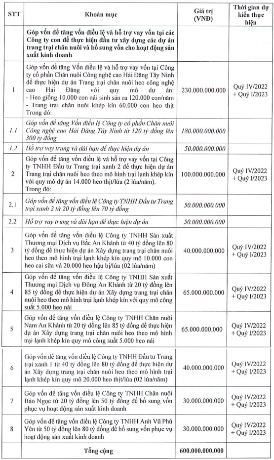 Toàn bộ số tiền huy động được từ đợt phát hành sẽ được BAF dùng để tăng vốn điều lệ và hỗ trợ vay vốn tại các công ty con để đầu tư xây dựng các dự án trang trại chăn nuôi. Tiêu biểu nhất trong đó là dự án Trang trại chăn nuôi heo công nghệ cao Hải Đăng tại CTCP Chăn nuôi Công nghệ cao Hải Đăng Tây Ninh với quy mô 10,000 con nái sinh sản ra 120,000 heo con/năm, ngoài ra còn có trang trại chăn nuôi khép kín 60,000 con heo thịt.