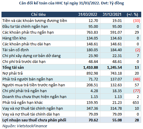 Tính đến thời điểm 31/03/2022, tổng tài sản của HHC đạt gần 1,411 tỷ đồng, tăng 13% so với đầu năm, chủ yếu do khoản phải thu ngắn hạn tăng 29% lên gần 764 tỷ đồng.