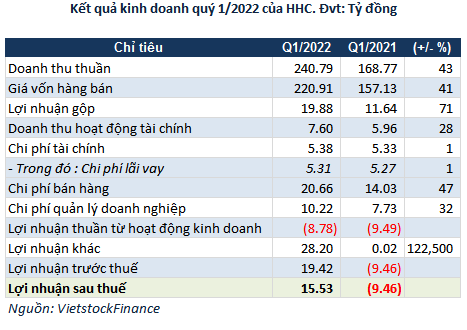 Sau quý đầu năm, HHC đạt gần 241 tỷ đồng doanh thu thuần, tăng 43% so với cùng kỳ năm trước. Lợi nhuận gộp theo đó đạt gần 20 tỷ đồng, tăng 71%.