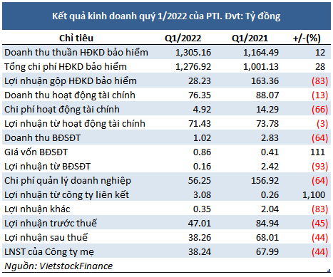 Kết thúc quý 1/2022, Tổng CTCP Bảo hiểm Bưu điện (HNX: PTI) ghi nhận lợi nhuận ròng giảm 44% so với cùng kỳ năm trước, còn hơn 38 tỷ đồng, chủ yếu do hoạt động kinh doanh bảo hiểm có lợi nhuận giảm đến 83%.