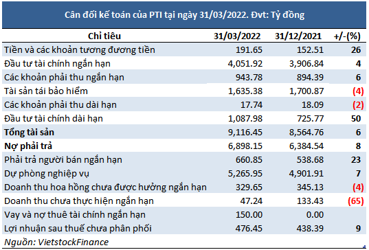 Tính đến ngày 31/03/2022, tổng tài sản của PTI đạt hơn 9,116 tỷ đồng, tăng 6% so với đầu năm. Trong đó, tiền với các khoản tương đương tiền tăng 26%, lên gần 192 tỷ đồng và đầu tư tài chính dài hạn tăng 50%, lên gần 1,088 tỷ đồng.