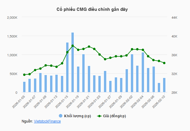 Trên thị trường chứng khoán, không lâu sau khi BCTC được công bố, giá cổ phiếu CMG lập tức biến động mạnh. Sau phiên tăng gần 4% trong ngày 02/02, CMG liên tục điều chỉnh và kết phiên 10/02 chỉ còn 34,150 đồng/cp. Diễn biến này thu hẹp đà tăng kể từ đầu năm 2026 còn hơn 5%, mặc cho cổ phiếu công nghệ này từng có lúc tiến sát ngưỡng 37,000 đồng/cp.
