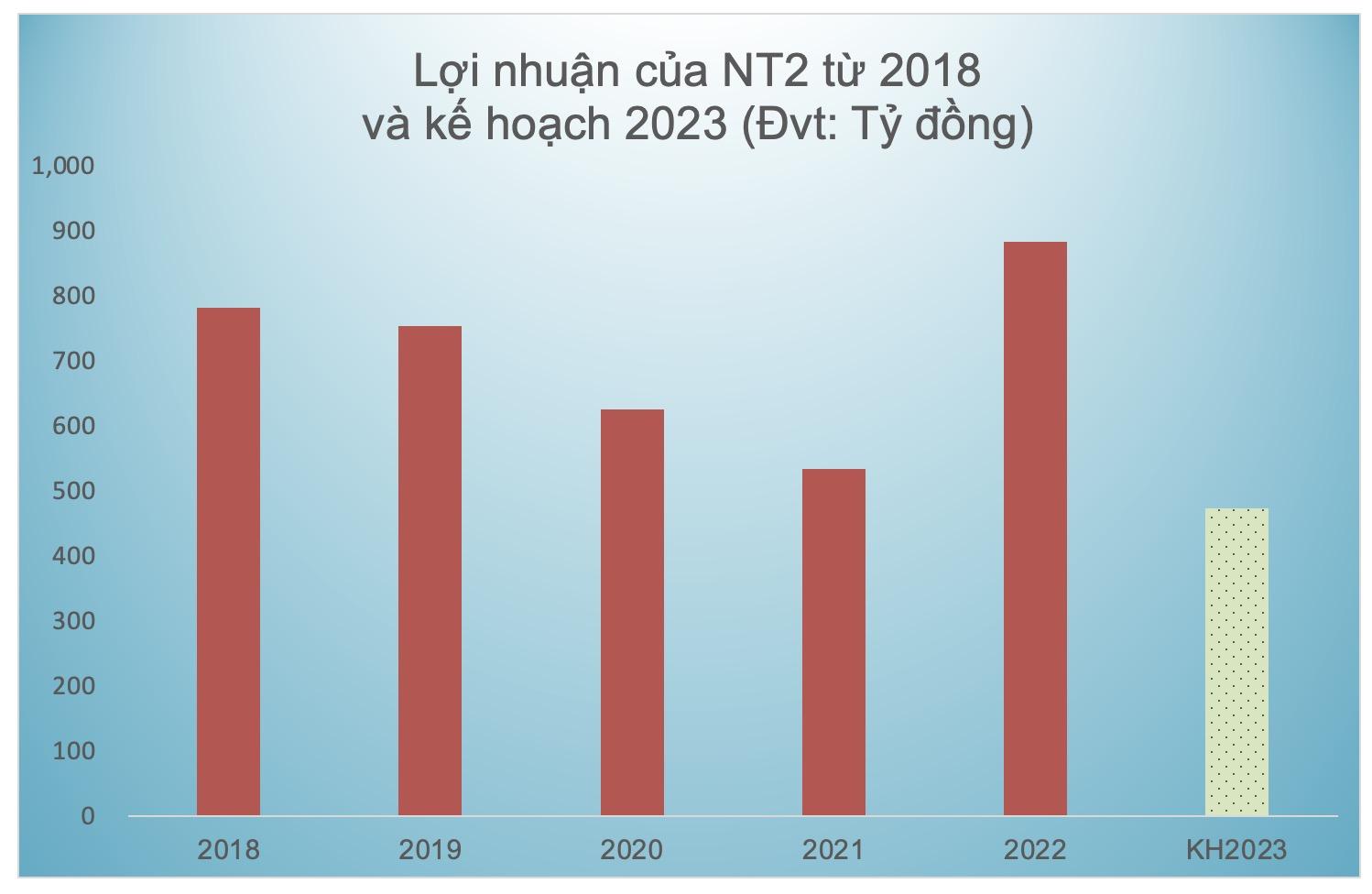 Đối với kế hoạch 2023, tại đại hội, HĐQT NT2 đặt mục tiêu tổng doanh thu gần 8.3 ngàn tỷ đồng, giảm khoảng 5% so với thực hiện 2022. Tuy nhiên, lợi nhuận sau thuế mục tiêu chỉ là 473 tỷ đồng, giảm hơn 46%. Chỉ tiêu nộp ngân sách là 234 tỷ đồng.Về chỉ tiêu sản lượng, NT2 đặt kế hoạch sản lượng điện 4.1 tỷ kWh, giảm 5.5%; khối lượng khí 779 triệu Sm3.