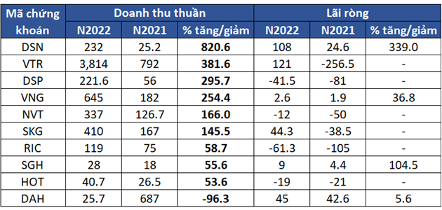 Doanh nghiệp cung cấp dịch vụ vận tải biển - Superdong Kiên Giang (HoSE: SKG) công bố doanh thu gấp 2.4 lần, đạt 410 tỷ đồng; lãi ròng 44 tỷ đồng trong khi năm 2021 lỗ 39 tỷ đồng. Công viên nước Đầm Sen (HOSE: DSN) báo cáo lợi nhuận gấp 4.3 lần năm 2021, đạt 108 tỷ đồng.