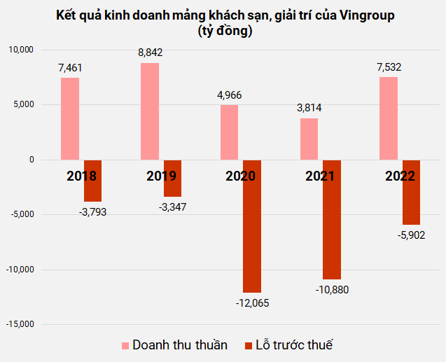 Với thương hiệu Vinpearl, mảng dịch vụ khách sạn, du lịch, vui chơi giải trí của Tập đoàn Vingroup (HOSE: VIC) đã có sự cải thiện trong năm qua. Doanh thu thuần đạt 7,532 tỷ đồng, gần gấp đôi cùng kỳ; lỗ trước thuế 5,902 tỷ đồng, giảm so với mức 10,880 tỷ đồng năm 2021. Như vậy, doanh thu mảng này đã gần về mức trước dịch 2019 là 8,843 tỷ đồng.