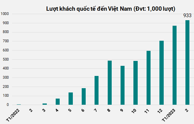 Kể từ tháng 09/2022, lượng khách quốc tế có sự tăng dần đều và tính đến tháng 02/2023 đã ngấp nghé ngưỡng 1 triệu lượt. Theo Tổng cục Thống kê, khách quốc tế đến Việt Nam tháng 2 đạt 933,000 lượt người, tăng 7.1% so với tháng trước và gấp 32 lần so với cùng kỳ năm trước. Tính chung 2 tháng đầu năm, khách quốc tế đến nước ta đạt 1.8 triệu lượt, gấp gần 37 lần cùng kỳ năm trước nhưng vẫn chưa bằng 60% so với cùng kỳ năm 2019.
