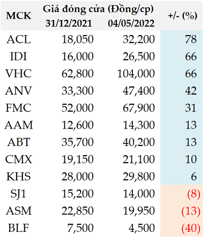 Tốc độ tăng trưởng giá cổ phiếu nhóm doanh nghiệp thủy sản từ đầu năm 2022 đến nay Nguồn: VietstockFinance |