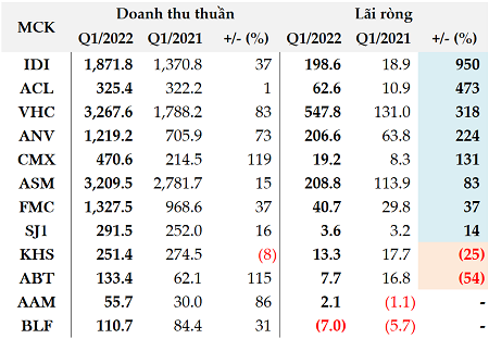 Cùng nhóm, nhờ doanh số tiêu thụ tăng, dự trữ nguyên liệu và ký hợp đồng có dự tính biến động giá cước vận chuyển đã giúp lãi ròng quý 1 của CTCP Thực phẩm Sao Ta (HOSE: FMC) tăng 37% so với cùng kỳ, đạt gần 41 tỷ đồng.
