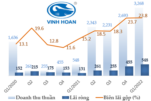 “Nữ hoàng cá tra” Vĩnh Hoàn (HOSE: VHC) cũng báo lãi ròng gấp 4 lần cùng kỳ, đạt gần 548 tỷ đồng và biên lãi gộp tăng từ 15% lên 24%. Với kết quả khả quan trong quý đầu năm, đại diện Công ty chia sẻ tại cuộc họp ĐHĐCĐ thường niên 2022: “Chúng tôi rất lạc quan và vui mừng khi thấy nhu cầu tăng trưởng tốt của thị trường do thiếu nguồn cung, đơn hàng về nhà máy khá tốt để phục vụ cho nhu cầu mở cửa trở lại. Bên cạnh đó, khách hàng ở thị trường Châu Âu và Mỹ tiêu thụ khá tốt. Do đó, chúng tôi đã điều chỉnh tăng mục tiêu lợi nhuận 2022 từ 1,500 tỷ đồng lên 1,600 tỷ đồng”.