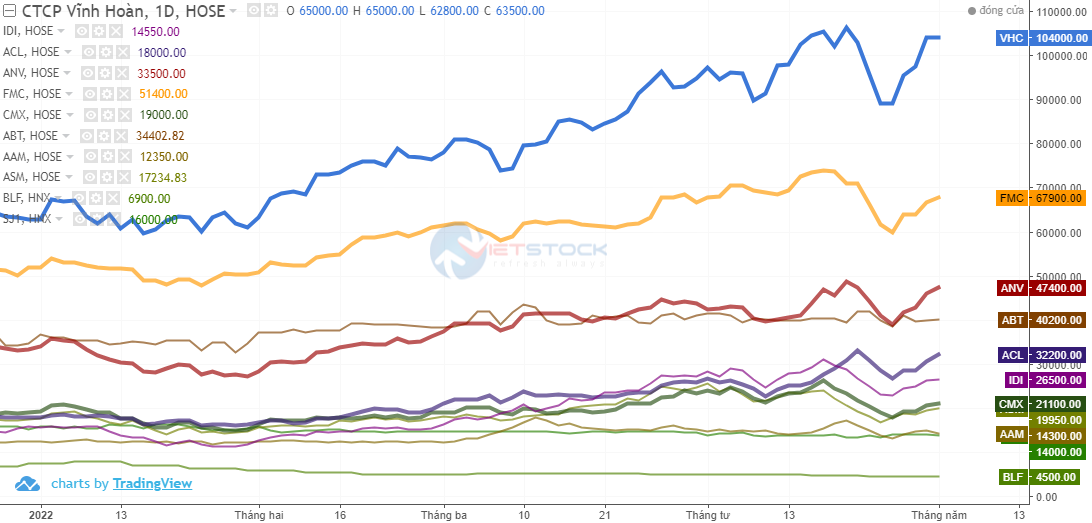 Liền sau đó là IDI và VHC với mức tăng đồng loạt 66%. Đáng chú ý, chốt phiên 04/05, thị giá của VHC đã chạm mốc 104,000 đồng/cp. Đây cũng là doanh nghiệp thủy sản đầu tiên có thị giá vượt ngưỡng trăm ngàn đồng/cp.