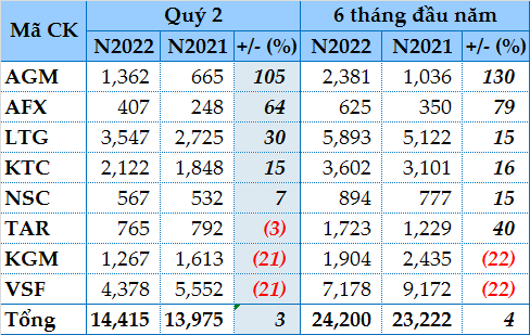 Theo thống kê của VietstockFinance, 8 doanh nghiệp kinh doanh gạo trên cả 3 sàn HOSE, HNX, UPCoM đạt tổng doanh thu 14,415 tỷ đồng và lãi ròng 95 tỷ đồng trong quý 2/2022, lần lượt tăng 3% và 10% so với cùng kỳ năm 2021. Lũy kế 6 tháng đầu năm, tổng doanh thu đạt 23,200 tỷ đồng, tăng 4% và lãi ròng đạt 334 tỷ đồng, tăng 36%.