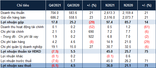 Kết quả kinh doanh quý 4 và năm 2021 của VCA. Đvt: Tỷ đồng ![]() Nguồn: BCTC quý 4/2021 của VCA |