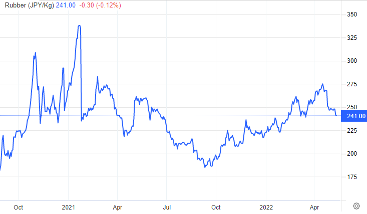Diễn biến giá cao su thế giới quý 1/2022 so với năm trước tính đến ngày 17/05/2022 Nguồn: Trading Economics |