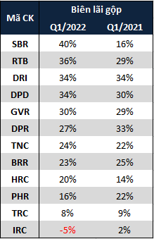 Biên lãi gộp của các doanh nghiệp cao su trong quý 1/2022 (Đvt: Tỷ đồng) Nguồn: VietstockFinance |