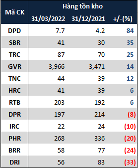 Hàng tồn kho của các doanh nghiệp cao su trong quý 1/2022 (Đvt: Tỷ đồng) Nguồn: VietstockFinance |
