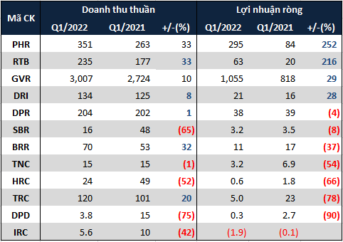Do ảnh hưởng từ giá cao su, đa phần doanh thu và lợi nhuận của các doanh nghiệp trong ngành đều tăng so với cùng kỳ. Theo dữ liệu từ VietstockFinance, tổng doanh thu từ cao su và lợi nhuận ròng của các doanh nghiệp trong ngành trong quý đầu năm 2022 lần lượt đạt 4,186 tỷ đồng và 1,493 tỷ đồng, tăng 11% và 45% so với cùng kỳ 2021.