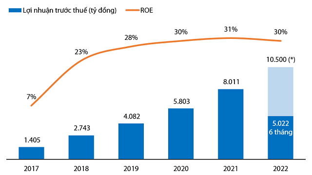 ![]() Nguồn: Báo cáo tài chính VIB. (*) Kế hoạch lợi nhuận trước thuế năm 2022. Lợi nhuận trước thuế và ROE của VIB giai đoạn 2017 – 2022 |