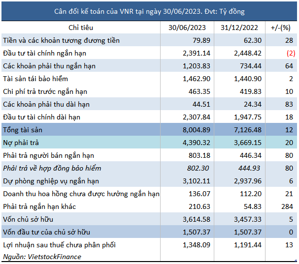 Tính đến ngày 30/06/2023, tổng tài sản của VNR tăng 12% so với đầu năm, đạt gần 8,005 tỷ đồng. Trong đó, đầu tư tài chính dài hạn tăng 18%, đạt gần 2,308 tỷ đồng, chủ yếu do tiền gửi dài hạn tăng 65% lên 728 tỷ đồng và ủy thác đầu tư tăng 15% lên gần 216 tỷ đồng.