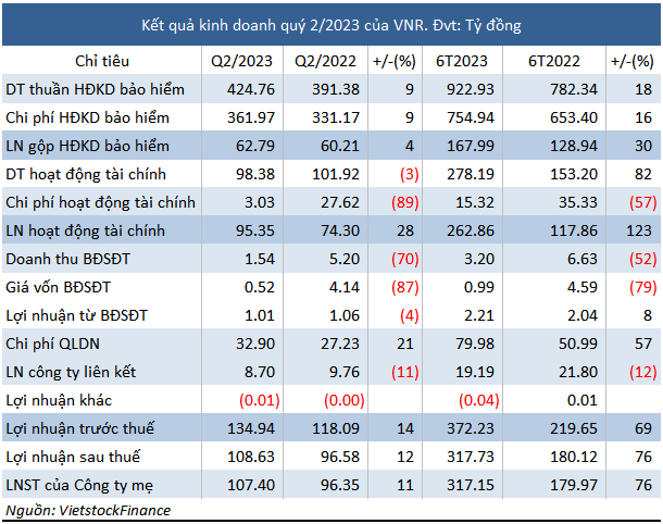 Tính chung 6 tháng đầu năm 2023, VNR đạt hơn 317 tỷ đồng lãi ròng, tăng 76% so cùng kỳ, nhờ lợi nhuận kinh doanh bảo hiểm tăng 30% lên gần 168 tỷ đồng và lợi nhuận hoạt động tài chính gấp 2.3 lần, đạt 263 tỷ đồng.