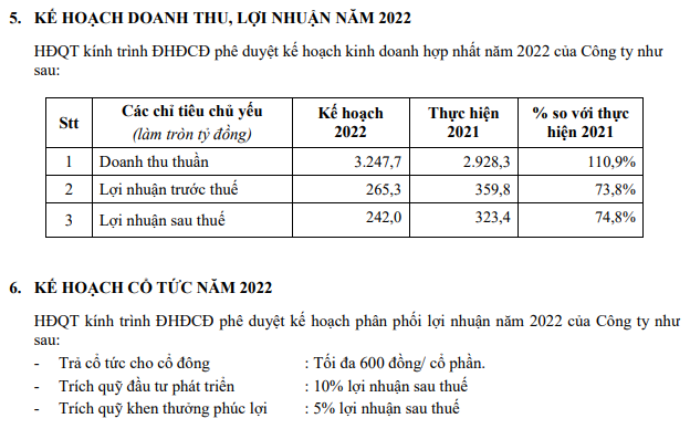 Về kế hoạch tài chính năm 2022, VLC dự kiến đem về doanh thu thuần 3,248 tỷ đồng, tăng 11% so với năm 2021. Tuy nhiên, lãi sau thuế đi lùi 25%, còn 242 tỷ đồng. Tỷ lệ chia cổ tức tiền mặt đạt 6%.