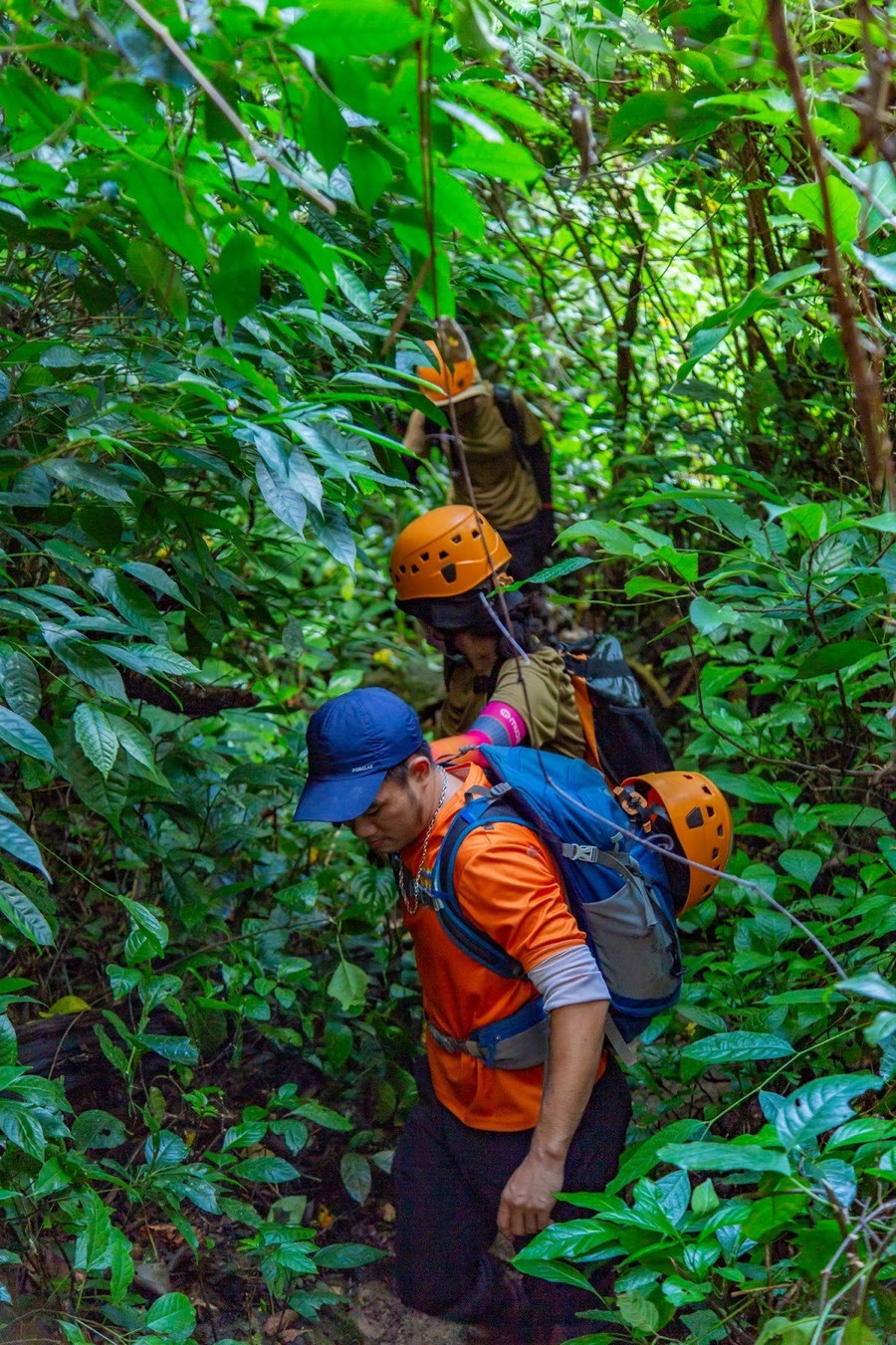 1. Du khách trekking dưới tán rừng nguyên sinh để tiến sâu vào vùng lõi Vườn quốc gia Phong Nha - Kẻ Bàng.