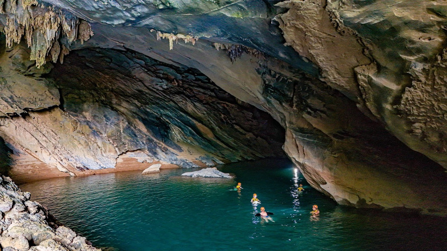 4. Bơi khám phá sông ngầm trong hang Trạ Ang với trang thiết bị chuyên dụng.