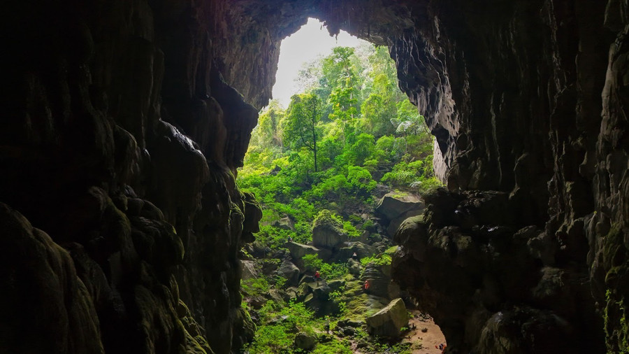 Bước vào bên trong, du khách sẽ thực sự choáng ngợp bởi không gian rộng lớn của hang động khô này. Từ trong bóng tối của lòng hang nhìn ra, cửa hang hình vòm cung cao tới 60 mét như một khung cửa sổ khổng lồ mở ra khu rừng nhiệt đới xanh tươi bên ngoài. Ánh sáng tự nhiên tràn vào, làm bừng sáng cả một vạt dương xỉ và cây cối mọc dày đặc ngay thềm hang, tạo nên sự tương phản mạnh mẽ với những vách đá sần sùi, tối sẫm bên trong.