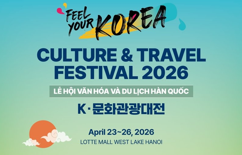 Ngày 22/4, tin từ Trung tâm Văn hóa Hàn Quốc tại Việt Nam cho biết, từ ngày 23 - 26/4, Lễ hội Văn hóa - Du lịch Hàn Quốc 2026 sẽ diễn ra tại Trung tâm thương mại Lotte Mall Tây Hồ (Hà Nội).