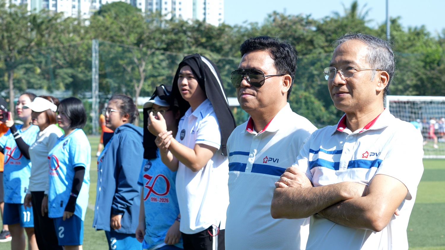 | Ông Vũ Anh Tuấn và ông Đặng Tiến Dũng - Phó Bí thư Đảng ủy, Chủ tịch Công đoàn PVI động viên, chụp ảnh cùng các đội bóng tham gia thi đấu. |