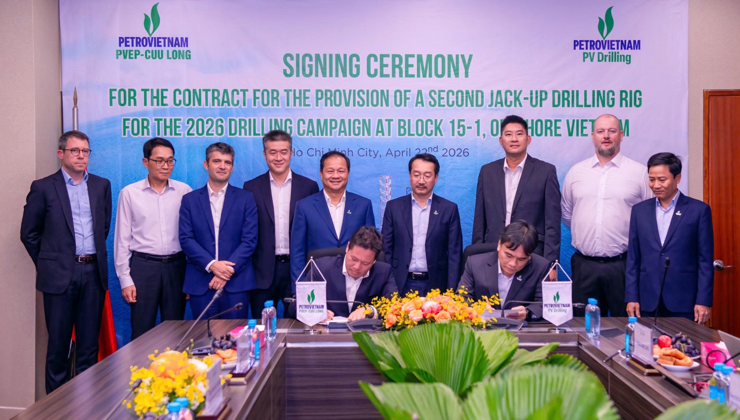 Ngày 22/4, tại TP HCM, Tổng công ty Cổ phần Khoan và Dịch vụ Khoan Dầu khí (PV Drilling), đơn vị thành viên của Tập đoàn Công nghiệp - Năng lượng Quốc gia Việt Nam (Petrovietnam), đã thực hiện lễ ký hợp đồng cung cấp giàn khoan tự nâng thứ hai cho chiến dịch khoan năm 2026 của khách hàng PVEP-Cửu Long tại Lô 15-1, ngoài khơi thềm lục địa Việt Nam.