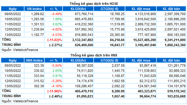 Giao dịch: Trong phiên cuối tuần, VN-Index giảm 56.07 điểm, kết phiên ở mức 1,182.77 điểm; HNX-Index giảm 13.13 điểm, xuống mức 302.39 điểm. Xét cho cả tuần, VN-Index giảm tổng cộng 146.49 điểm (-11.02%); HNX-Index giảm 41.07 điểm (-11.96%).