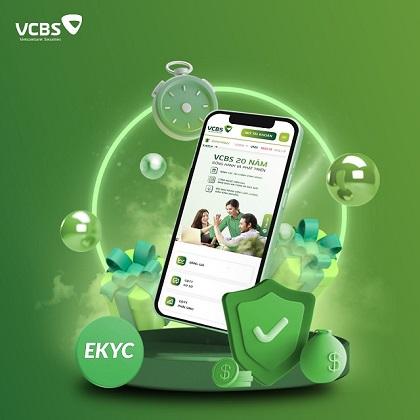 Với công nghệ eKYC, khách hàng có thể mở tài khoản chứng khoán trực tuyến ngay tại nhà, chỉ cần một thiết bị di động cài đặt ứng dụng VCBS Mobile, sẵn sàng CMND/CCCD và thao tác trong 1 phút là có thể hoàn tất quá trình mở 1 tài khoản chứng khoán.