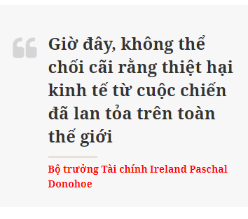 "Giờ đây, không thể chối cãi rằng thiệt hại kinh tế từ cuộc chiến đã lan tỏa trên toàn thế giới", Bộ trưởng Tài chính Ireland Paschal Donohoe bình luận sau cuộc họp với các bộ trưởng tài chính khác trong khu vực đồng EUR.