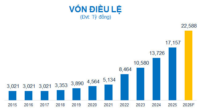 Đối với phương án phát hành cổ phiếu từ nguồn vốn chủ sở hữu, Ngân hàng dự kiến phát hành thêm 343.1 triệu cp cho cổ đông hiện hữu, tỷ lệ 20%, giá trị phát hành theo mệnh giá là 3,431 tỷ đồng. Nguồn vốn phát hành từ lợi nhuận lũy kế chưa phân phối và quỹ dự trữ bổ sung vốn điều lệ căn cứ trên BCTC năm 2025 đã kiểm toán của Nam A Bank. Thời gian dự kiến phát hành trong quý 2/2026, sau khi Ngân hàng nhận được văn bản chấp thuận của Ngân hàng Nhà nước (NHNN) và Ủy ban Chứng khoán Nhà nước (UBCKNN).