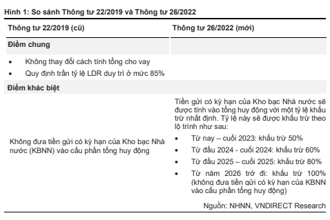 Chuyên gia phân tích của VNDiect đánh giá Thông tư 26 sẽ có tác động tích cực lên thanh khoản hệ thống, khi có khoảng 50% tiền gửi Kho bạc Nhà nước có kỳ hạn tại các ngân hàng thương mại (ước tính hơn 150,000 tỷ đồng, dựa trên số liệu BCTC quý 4/2022), sẽ có khả năng được tính vào phần dư địa cho vay của hệ thống. Theo đó, phần nào sẽ giảm áp lực lên lãi suất cho vay.