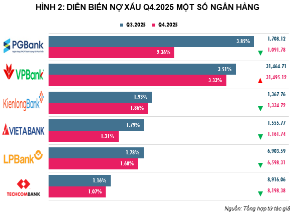 Bên cạnh đó, các ngân hàng như PGB, KLBLPB đều có tỷ lệ nợ xấu giảm so với quý trước. Với PGBank, tỷ lệ giảm mạnh nhất từ khoảng 3.85% xuống 2.36% trong quý 4, phản ánh nỗ lực thu hồi nợ, đặc biệt là thu hồi gốc và lãi của các khoản nợ đã sử dụng dự phòng, cùng với việc cân đối danh mục tín dụng, cụ thể nợ xấu giảm đáng kể trong khi dư nợ tín dụng tăng so với cùng kỳ. LPB là một tiêu biểu khi ngân hàng công bố vẫn kiểm soát được tỷ lệ nợ xấu ở mức 1.68%, trong bối cảnh tăng trưởng tín dụng tích cực và chi phí vận hành được tối ưu, cho thấy chất lượng tài sản duy trì sự ổn định tương đối trong năm. KLB cũng ghi nhận mức nợ xấu dưới 2% cùng với lộ trình gia tăng trích lập dự phòng và kiểm soát nợ cần chú ý hiệu quả.