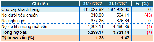 Chất lượng nợ vay góp thêm điểm sáng trong quý 1 của Sacombank. Tổng nợ xấu tại ngày 31/03/2022 giảm 7% so với đầu năm, chỉ còn hơn 5,299 tỷ đồng, giảm mạnh nhất là nợ dưới tiêu chuẩn (-43%). Kết quả, kéo tỷ lệ nợ xấu trên dư nợ vay giảm từ mức 1.47% đầu năm xuống còn 1.28%.