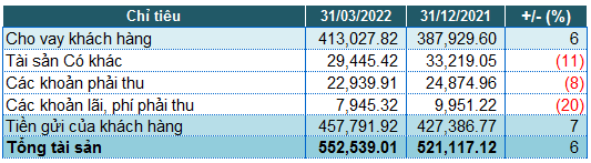 Tính đến cuối quý 1, tổng tài sản Ngân hàng tăng 6% so với đầu năm, lên mức 552,539 tỷ đồng. Trong đó, tiền mặt tăng 20% (9,874 tỷ đồng), tiền gửi tại TCTD khác tăng 64% (12,600 tỷ đồng), cho vay khách hàng tăng 6% (413,027 tỷ đồng)…
