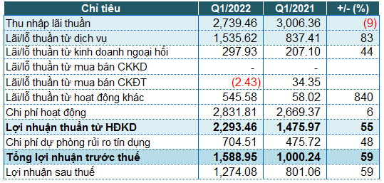 Trong khi đó nguồn thu ngoài lãi lại được đẩy mạnh so với cùng kỳ như lãi từ dịch vụ tăng 83% (91,536 tỷ đồng), lãi từ kinh doanh ngoại hối tăng 44% (298 tỷ đồng), lãi từ hoạt động khác gấp 9.4 lần (546 tỷ đồng)…
