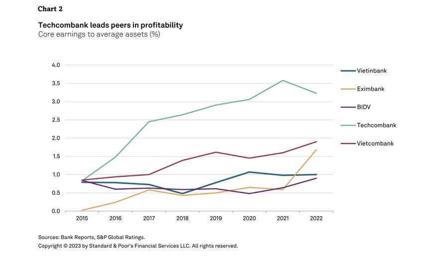 Theo S&P, TCB có tỉ lệ thu nhập lõi/tài sản trung bình ở mức 3.2% trong 4 năm gần nhất, so với mức chỉ 1% của các ngân hàng khác. TCB là ngân hàng có khả năng sinh lời đứng thứ 4 Việt Nam, giúp TCB có thể tự duy trì tăng trưởng tài sản mà không cần phát hành thêm vốn.
