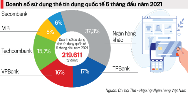 Số liệu cập nhật từ Chi hội Thẻ (Hiệp hội Ngân hàng Việt Nam) cho biết, doanh số sử dụng thẻ tín dụng quốc tế tăng trung bình 33%/năm trong từ 2018 đến 2020. Trong 6 tháng đầu năm 2021, tỷ lệ này tăng 32% so với cùng kỳ, đạt 219.611 tỷ đồng.