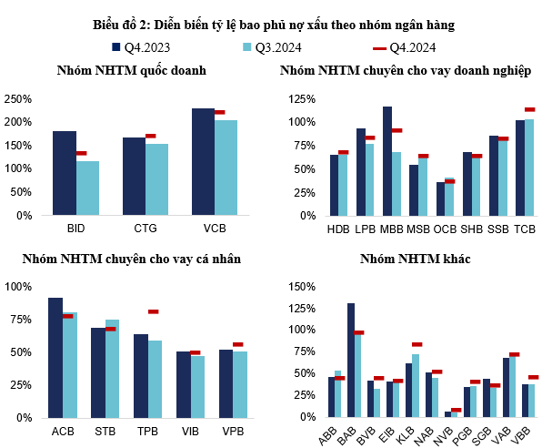 Xét theo nhóm ngân hàng, khối ngân hàng quốc doanh có mức bao phủ nợ xấu tốt hơn hẳn so với các ngân hàng tư nhân. Trong nửa đầu năm 2024, tỷ lệ bao phủ nợ xấu của nhóm này giảm mạnh từ 188.46% xuống 144.53% nhưng đã phục hồi lên 165.44% vào cuối năm, tương đương với việc bổ sung hơn 24,000 tỷ đồng chi phí dự phòng trong quý 3 và quý 4. Trong khi đó, các ngân hàng tư nhân có xu hướng đi ngang, với tỷ lệ bao phủ nợ xấu của nhóm chuyên cho vay doanh nghiệp đạt 76.08%, nhóm cho vay cá nhân đạt 61.84%, còn nhóm ngân hàng thương mại khác duy trì mức dưới 50%, đến cuối năm 2024 chỉ nhích nhẹ lên 35.24%.