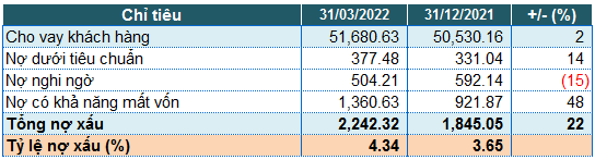 Chất lượng nợ vay của VietBank cũng đi lùi so với đầu năm, tổng nợ xấu tính đến 31/03/2022 tăng 22%, ghi nhận 2,242 tỷ đồng. Trong đó, nợ có khả năng mất vốn tăng mạnh nhất. Kết quả, đẩy tỷ lệ nợ xấu trên dư nợ tăng từ 3.65% lên 4.34%.