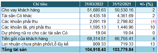 Tính đến cuối quý 1, tổng tài sản Ngân hàng xấp xỉ đầu năm, ở mức 104,918 tỷ đồng. Trong đó, tiền mặt tăng 13% (624 tỷ đồng), tiền gửi tại TCTD khác tăng 19% (17,114 tỷ đồng), cho vay khách hàng chỉ tăng 2% (51,680 tỷ đồng). Tiền gửi khách hàng tăng 4% (69,314 tỷ đồng).
