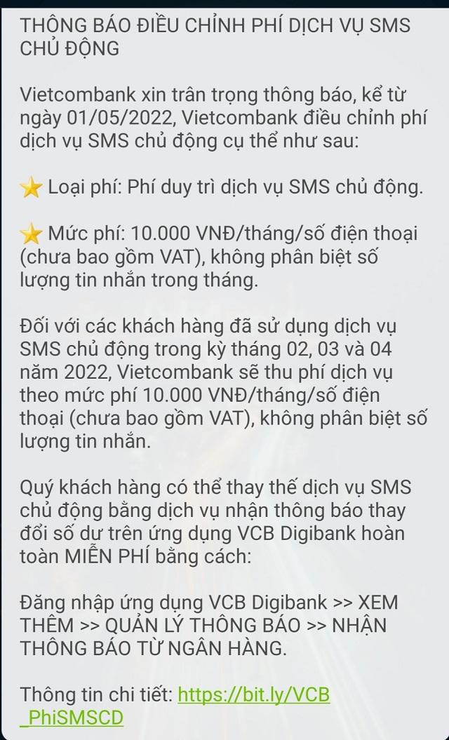 Vietcombank cũng cho biết đối với các khách hàng đã sử dụng dịch vụ SMS chủ động trong kỳ tháng 2, 3 và 4 năm 2022, Vietcombank cũng chỉ thu phí dịch vụ theo mức phí 11,000 đồng/tháng/số điện thoại, không phân biệt số lượng tin nhắn.