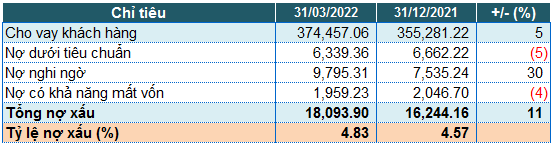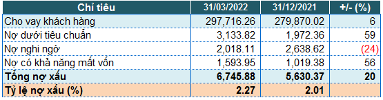 Tính riêng Ngân hàng mẹ, tổng nợ xấu tại ngày 31/03/2022 gần 6,746 tỷ đồng, tăng 20% so với đầu năm. Tỷ lệ nợ xấu trên dư nợ vay cũng tăng từ mức 2.01% đầu năm lên 2.27%.