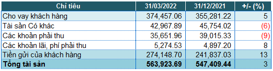 Tính đến cuối quý 1, tổng tài sản Ngân hàng tăng nhẹ 3% so với đầu năm, lên gần 563,924 tỷ đồng. Trong đó, tiền gửi tại NHNN giảm mạnh 56% (còn 4,753 tỷ đồng), cấp tín dụng cho TCTD khác giảm 27% (còn 12,356 tỷ đồng), cho vay khách hàng tăng 5% (374,457 tỷ đồng).