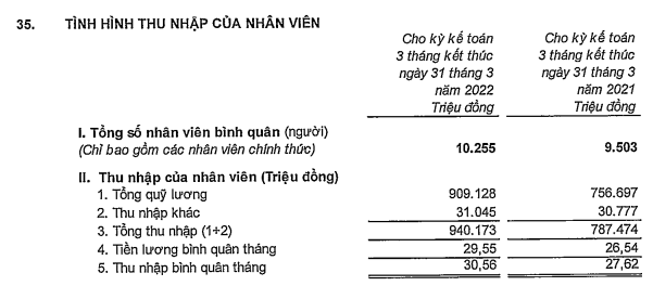 Thu nhập bình quân tháng của nhân viên trong quý đầu năm tăng đến 11% so cùng kỳ, lên mức 30.56 triệu đồng/người/tháng.