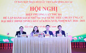 Hội nghị hiệp thương lần ba, tỉnh Lào Cai thống nhất lựa chọn, lập danh sách những người đủ tiêu chuẩn ứng cử đại biểu HĐND tỉnh khóa XVII gồm 105 người. Trong đó, nam 68 người, nữ 37 người; dân tộc Kinh 61 người, dân tộc Tày 17 người, dân tộc Mông 10 người, dân tộc Dao 6 người, dân tộc Giáy 3 người, dân tộc Thái 2 người; dân tộc Cao Lan 2 người; các dân tộc gồm Nùng, Mường, Thổ, Hà Nhì, mỗi dân tộc có 1 người; 32 đại biểu trẻ tuổi; ngoài Đảng 7 người và 33 người tái cử.